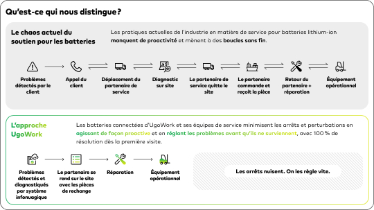 UgoWork a été conçu pour éliminer ces coûts cachés. Tout ce qu’on développe vise la performance — pour que vous n’ayez pas à surveiller vos batteries en permanence. Ce n’est pas une guerre de fiches techniques. Ce qui compte, c’est ce que votre fournisseur s’engage à faire une fois la vente conclue. C’est une question de tranquillité d’esprit. Et quand vous gérez une flotte qui ne peut pas se permettre de s’arrêter, c’est un investissement qui en vaut largement la peine.